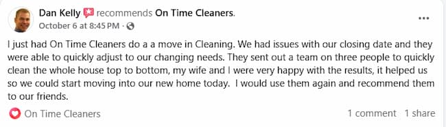 I just had On Time Cleaners do a move in Cleaning. We had issues with our closing date and they were able to quickly adjust to our changing needs. They sent out a team of three people to quickly clean the whole house top to bottom, my wife and I were very happy with the results, it helped us so we could start moving into our new home today. I would use them again and recommend them to our friends.